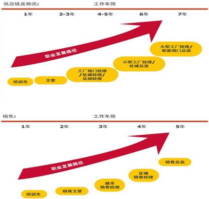 在快速消費品行業,員工的工作熱情和成績決定他們的職位和薪水。從業務員到銷售經理的經歷并不乏見,而應屆畢業生進入該行業之后更是大多嘗遍輪崗制的滋味。在快速消費品行業里,你不能一直當個小小的營業員,更不能一直原地踏步,因為激烈的行業競爭使你不敢冒被新人取代的危險,而且一般企業就是小小的便利店都會制定詳實的員工晉升梯度和淘汰機制,大型企業還往往會為員工量身定做完整的職業規劃。讓我們來看一下部分名企的例子: