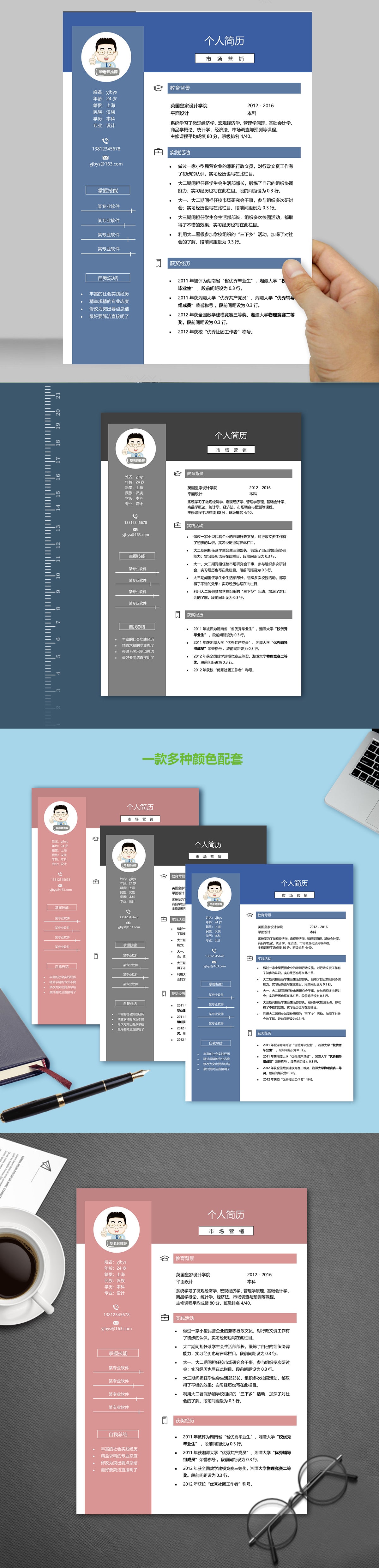 A636簡約藍色,粉色,綠色簡歷模板