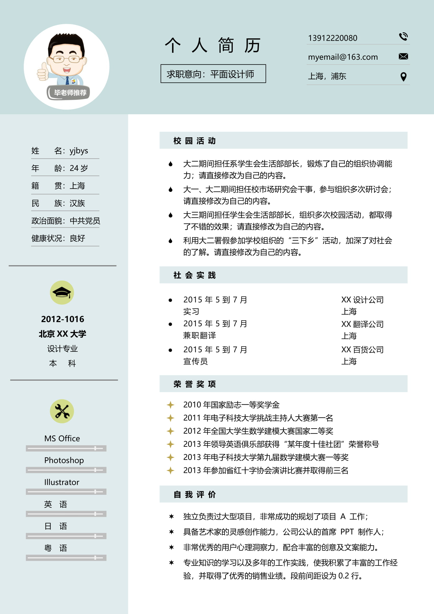 A568常用天藍,青灰,粉紅簡歷模板